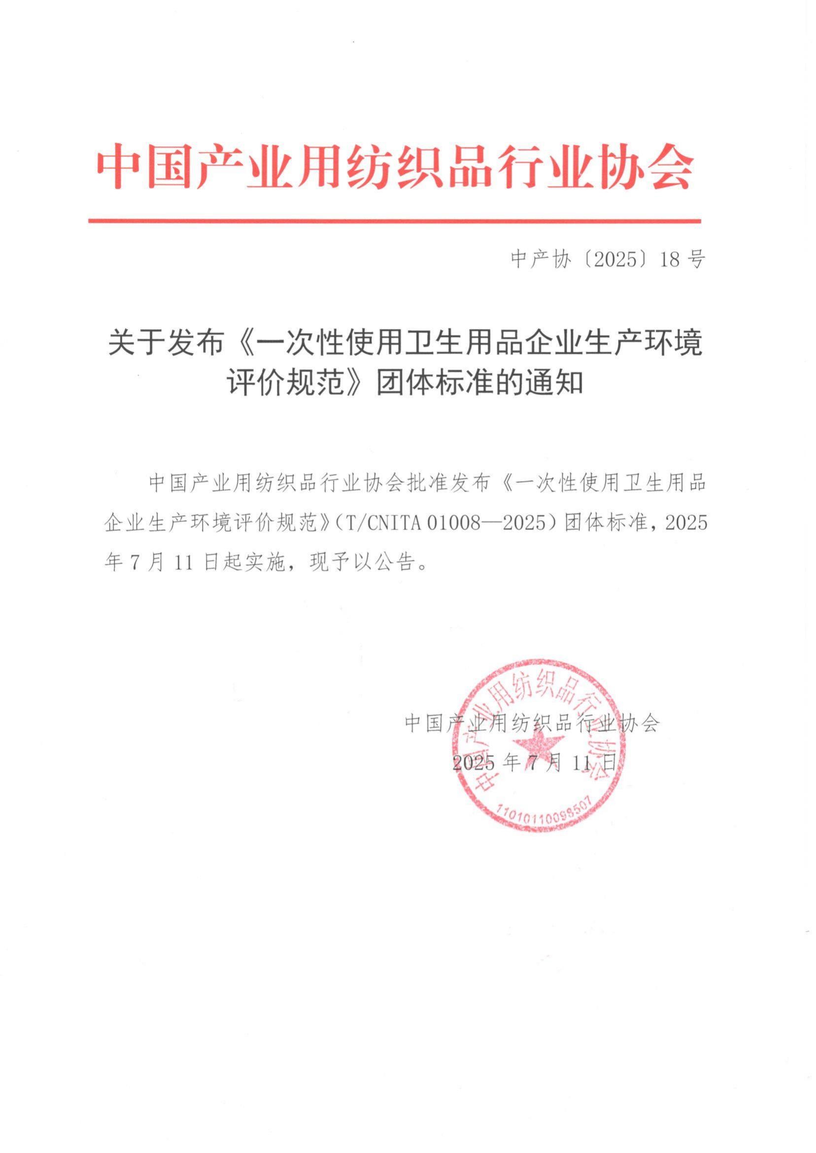 关于发布《一次性使用卫生用品企业生产环境评价规范》团体标准的通知
