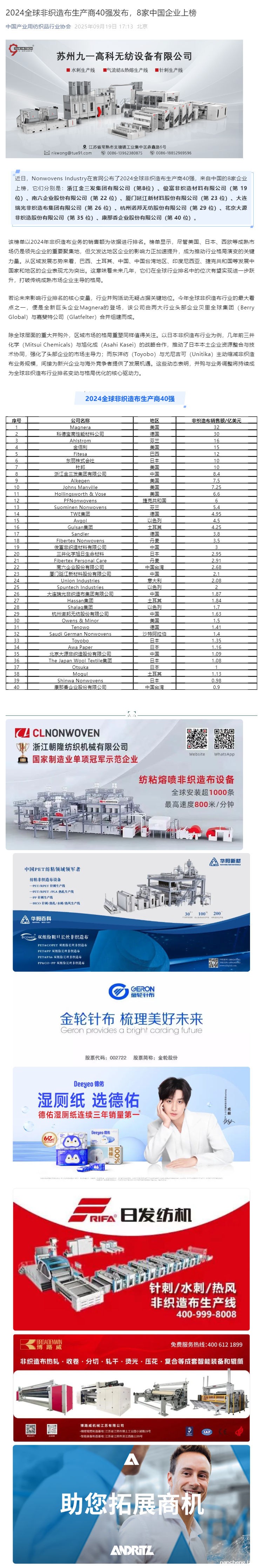 2024全球非织造布生产商40强发布,8家中国企业上榜