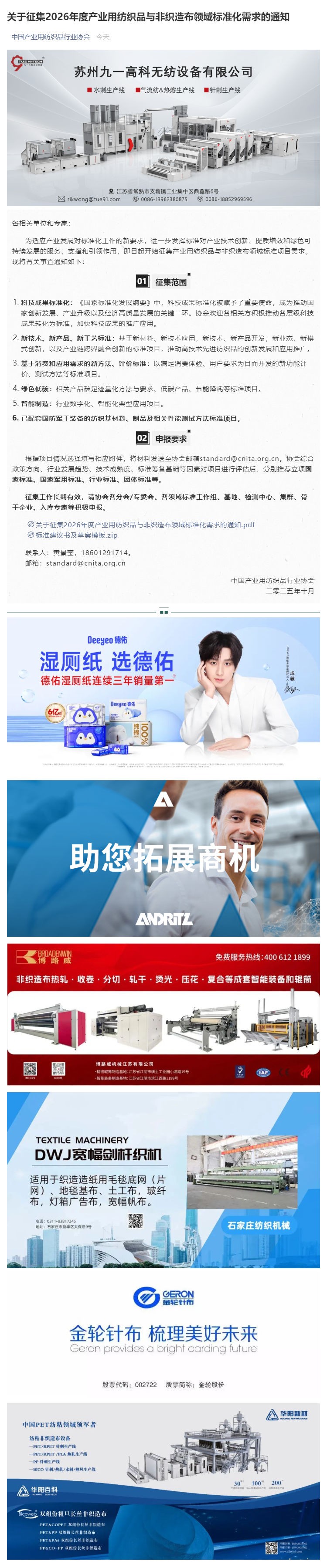 关于征集2026年度产业用纺织品与非织造布领域标准化需求的通知