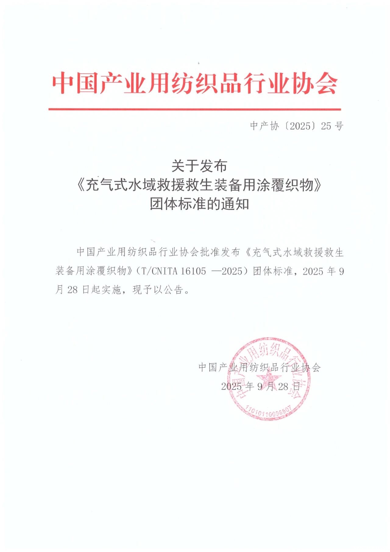 TCNITA 16105-2025 《充气式水域救援救生装备用涂覆织物》